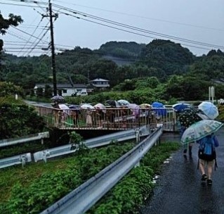 1年生の子どもたちは学校の周りを探検しました。小雨が降っていたため、傘をさしての出発となりました。