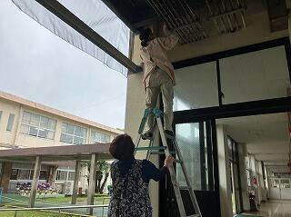 雨の吹込みが激しい体育館は全職員で対策しました。