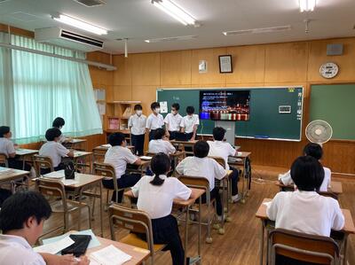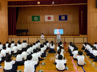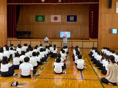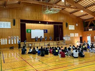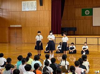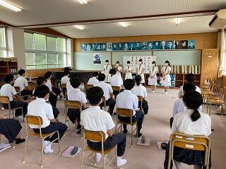 英語での歓迎の言葉を8年生が述べたり、代表の学年が出し物をしたりと、ともてにぎやかに歓迎の気持ちを表しました。