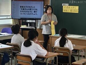 その中、6年の黒木陽子Tが社会(歴史)の授業を公開しました。子供たちは、大化の改新の時代背景や中心人物の中大兄皇子、中臣鎌足、その後天智天皇、藤原鎌足になったことなどを自信をもって発表していました。今後が楽しみです。