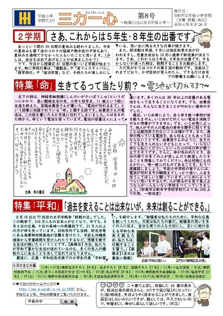 8/26(金)、令和4年度「平岩小中学校だより三力一心№8」を発行しました。