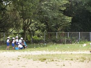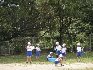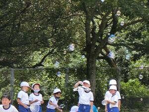 1年生は、今日の3・4時間目(生活科の時間)にシャボン玉を作りました。たくさんのシャボン玉が、風にのって気持ちよさそうに飛んでいました。1つ1つがキラキラかがやいていて、とてもきれいでした。
