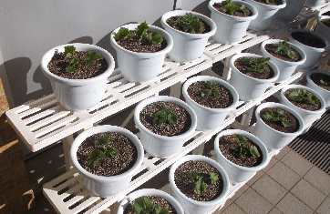 卒業式を彩るサイネリアの苗が日当たりのよい校舎の南側に並びました。春への準備が始まっています。