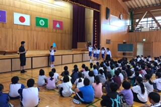 小学部集会で運営委員会の子ども達が、「横断歩道の渡り方」と「あいさつ」についての発表をしました。