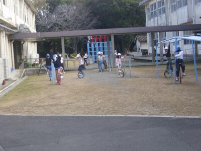 小学生が一生懸命、一輪車に乗っています。皆競うように遊んでいました。