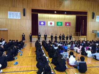本日の全校朝会は、地域ボランティアの方の紹介がありました。
