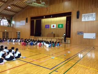 本日全校朝会終了後、本校卒業生で五ヶ瀬中等教育学校に進学した生徒が5・6年生に向けて五ヶ瀬や五ヶ瀬中等教育学校の事について話をしてくれました。