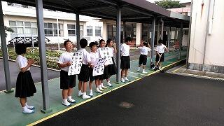 大雨の次の日でしたが、小学部の運営委員会(児童会)が朝から元気にあいさつ運動をがんばっていました。「①自分から ②伝わる声で ③場に応じてえしゃく」の意識が広まるようにという「思い」が感じられました。