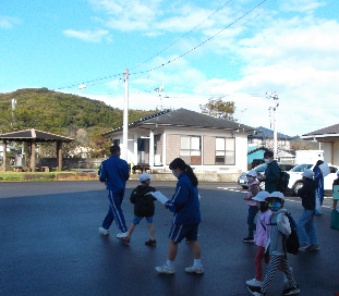 1年生から9年生の縦割班で校区内のポイントを回るウォークラリーです。中学部生や上級生がやさしく安全に低学年を気遣いながら歩いてくれていました。