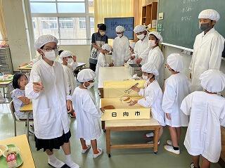とても楽しそうに給食当番の仕事をしている1年生でした。