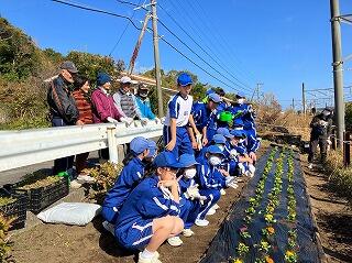 また、9年生は地域の方と一緒に駅周辺の花壇の花植えをしました。