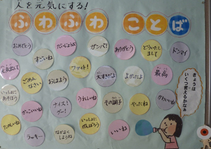 現在、保健室廊下に「人を元気にする ふわふわ言葉」を掲示しています。