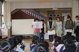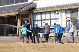 避難した後は、消火器の使い方を水消火器を使って説明していただきました。教師1名、6年生代表者2名で体験しました。6年生は放水体験もし、放水するときのホースの重さも体験できたようです。