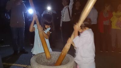旧暦8月1日に行われる「おきよ祭り」ですが、今年は先日の台風の関係で海に笹は流せませんでしたが、つきいれ団子作り体験をさせていただいたり、つきたての団子をいただいたりと貴重な経験ができました。