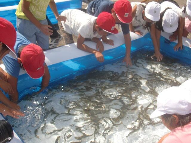 17日(火)に2,3年生で美々津港へ稚魚放流に行きました。美幸内水面漁業協同組合の方に協力して頂き、鮎・鰻・カニを放流しました。