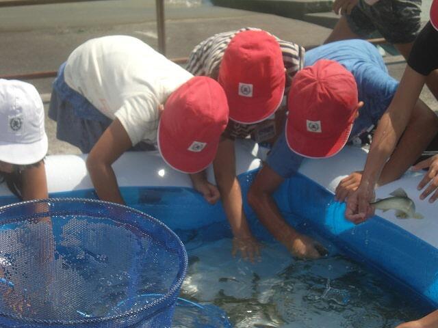 子ども達の中には初めて魚に触れる子どももいて、本物の魚の感触を味わっていました。「鰻がぬるぬるする~」「カニに、はさまれた」「また帰って来てね」と言う子どもなどいて楽しんでいました。