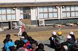 避難した後は、消火器の使い方を水消火器を使って説明していただきました。教師1名、6年生代表者2名で体験しました。6年生は放水体験もし、放水するときのホースの重さも体験できたようです。