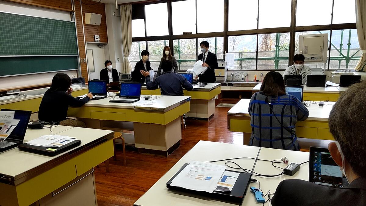 作業終了後には職員への説明会も行われました。最初にシステム導入が完了しました本校での説明会の様子は、市内の各学校へオンラインで配信されたところです。