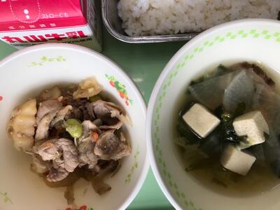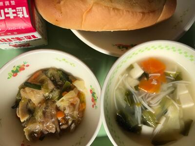 とろみのあるオイスターソースが食材(豚肉、竹の子、人参、タマネギ)にからみ美味しく仕上がっています。汁ビーフンも食べやすい献立でした。
