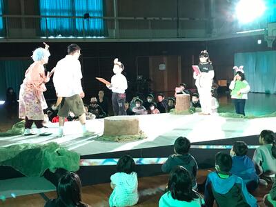 演出として、数名の子どもたちが(校長先生も)舞台にあがる場面がありました。キツネが化けた男の子が「どんな本を借りたの」と問いかけ、いくつかのやり取りがありました。観劇の時間は、何か不思議な空間と時間が流れているように思えました。