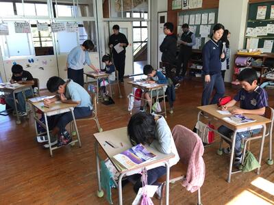 学校では、全職員で授業の相互参観を行い、授業についてのあり方について検討を行っています。授業を見ることにより、工夫やよさに気づくことができ、自らの授業改善にもつながっていきます。また、このような研修会は、美々津中学校区でも行われています。