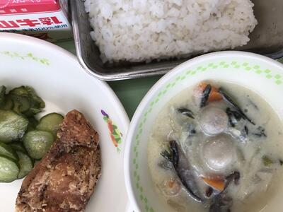 麦ご飯 魚のあまだれかけ 添え野菜 さつま汁
