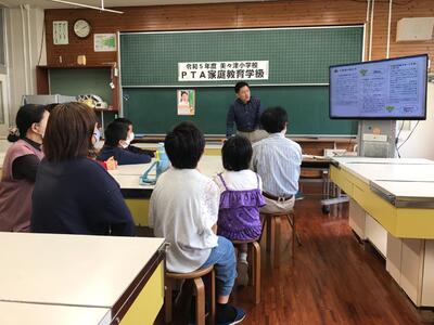 各校の家庭教育学級では様々な取組がなされており、美々津小でも講演会や研修大会への参加、実技研修等を行っています。また、美小、寺小、美中の3校合同での視察研修や合同研修会なども行われます。