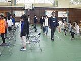 その後、体育館で離任式を行いました。離任式では、離任される4名の先生方を紹介した後、離任のあいさつをしていただきました。