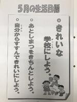 毎月、月の初めには全校朝会が行われます。コロナ禍では、朝会や集会活動を自粛していましたので、各教室で校内放送やタブレット画像にて実施されていました。現在は、体育館に集まり距離を保ちながら集会活動を再開しています。5月の全校朝会では、校長先生の話や生徒指導部の先生から「5月の生活目標」の話がありました。