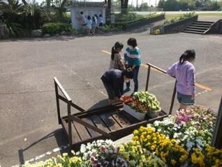 体育館設営をしたり、シートの雑巾がけをしたり、花を運んだりと、みんな一生懸命がんばっていました。