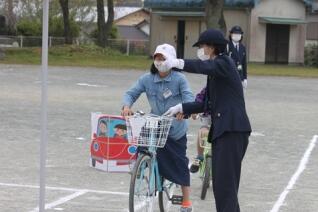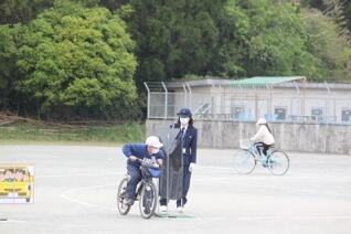 運動場の模擬道路を使って、実際に自転車に乗って練習をしました。左右の確認等、警察の方々が、子どもたちに優しく丁寧に教えてくださっていました。