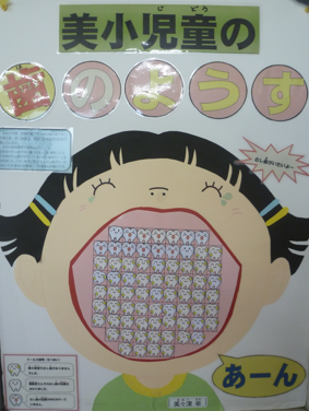 保健室前に「美々津幸さん」を掲示しています。いっぱい広げた幸さんの口には、たくさんの歯のシールが貼られており、現在の全校の治療状況が一目で分かるようになっています。