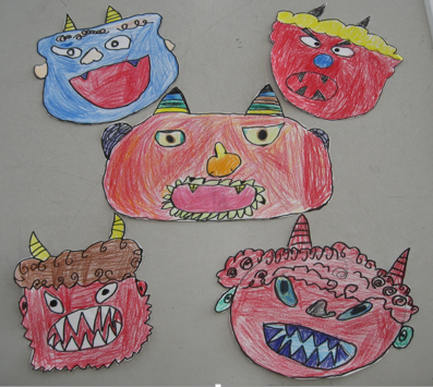 節分に合わせて、1年生の子どもたちが表情豊かな鬼のお面を作りました。本当は憎らしい鬼ではありますが、1年生が作ったお面は、愛嬌があって、とても憎めそうにありません。