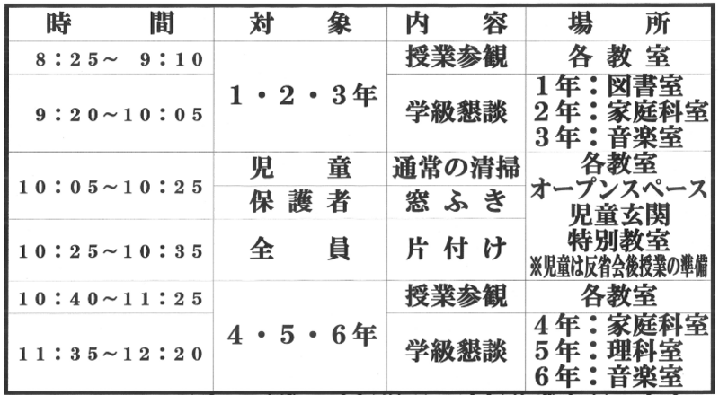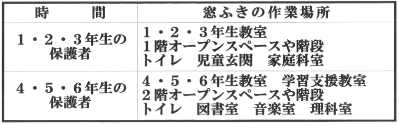 また、今回は授業参観及び学級懇談以外に、PTA奉仕作業(窓ふき)も計画していますので、ご協力をよろしくお願いします。