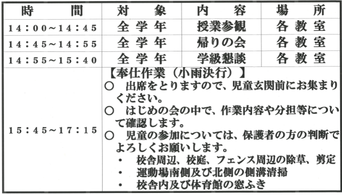 ご案内していましたように、明日は参観日及びPTA奉仕作業となっています。前回4月の参観日は中止となったことから、今回が本年度初めての参観日となります。