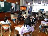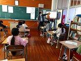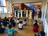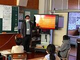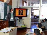 事務局の方は、ひょっとこのお面の種類や衣装、ひょっとこ踊りに関する物語、ひょっとこ踊りを広めた眼科医、橘ひょっとこ踊り保存会の紹介や活動の歴史、日向ひょっとこ夏祭りの内容や歴史など、ひょっとこ踊りについてプレゼンを交えながら分かりやすく詳しくお話しくださいました。特に、日向ひょっとこ夏祭りについては、その歩みや参加人数の推移、全国への浸透度、地域のもてなしとひょっとこ踊りを通した交流などについて詳しいお話がありました。子どもたちからいろいろな質問が出ましたが、一つ一つ丁寧に答えていただきました。立石さん、どうもありがとうございました。