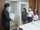 本校では、毎年、年末のこの時期に、児童会が中心となって赤い羽根共同募金活動に取り組んでいます。集まった募金について贈呈式を行い、社会福祉協議会の皆様にお渡ししました。