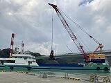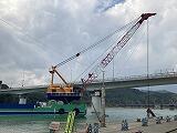 学校近くの耳川に架かる美々津大橋付近の下流域では、台風等の影響によりたくさんの土砂が堆積していることから、大型クレーンによる土砂の撤去作業が進められています。