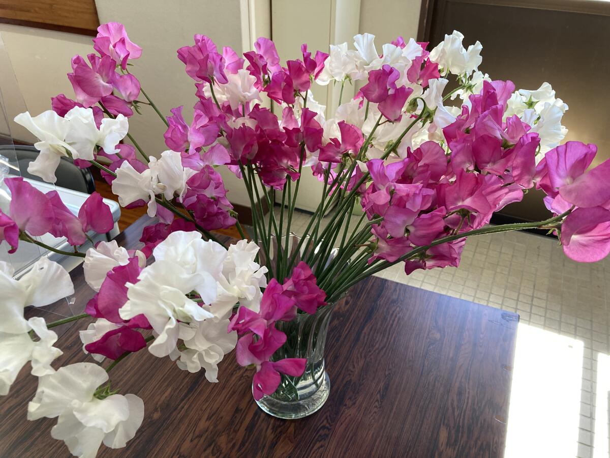 職員室に白とピンクの色鮮やかなスイートピーが飾られています。