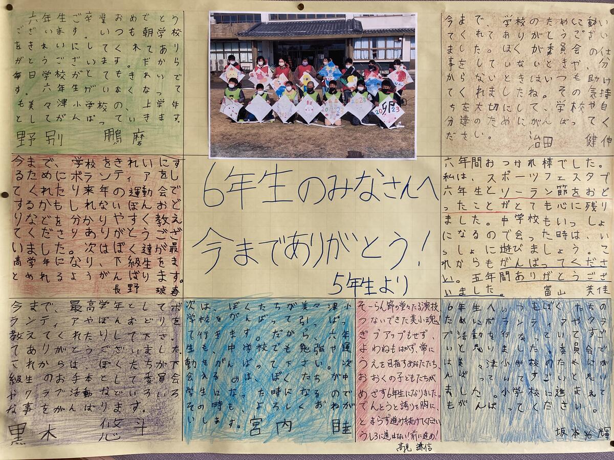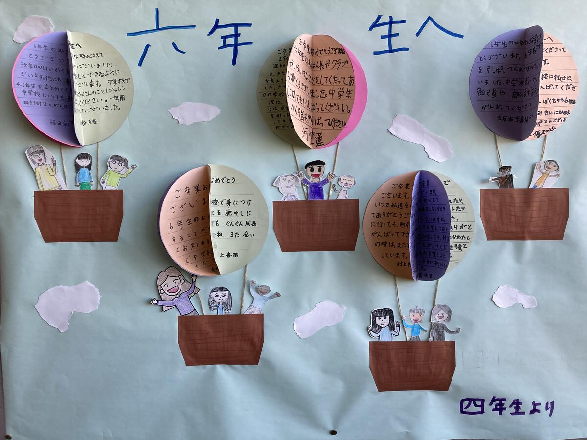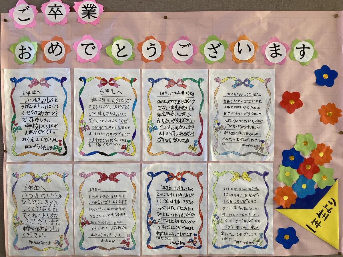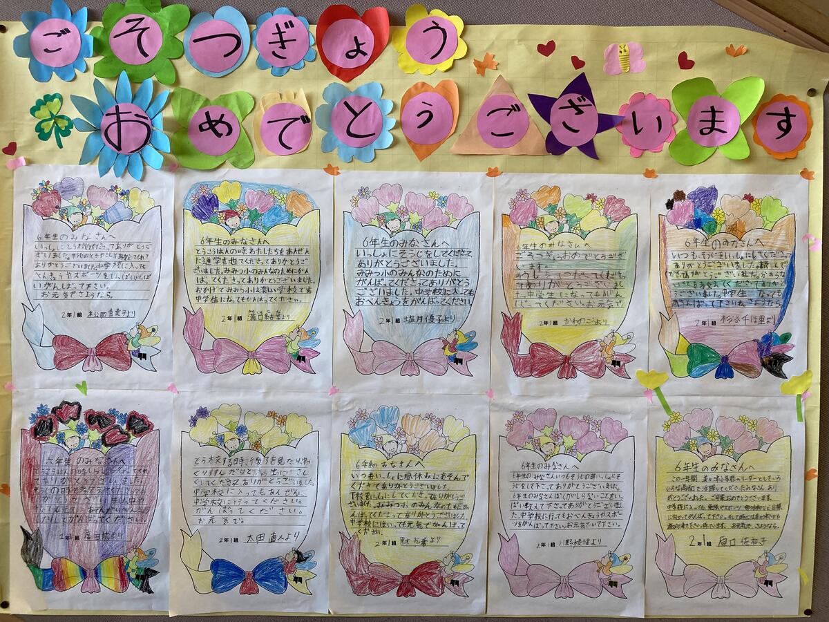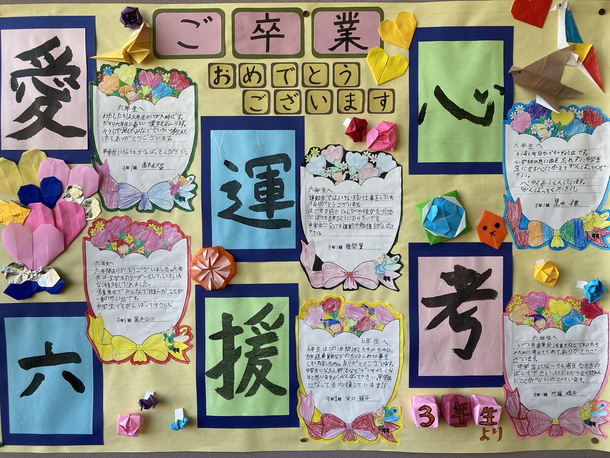 在校生の各学年が、お世話になった6年生に向けてお祝いや感謝のメッセージを作成し、校内に掲示しています。