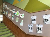 校内では、児童作品が教室だけでなく階段廊下壁面にも展示されています。絵画や習字、絵日記など学習の様子が感じられます。
