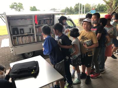 日向市移動図書館が美々津小学校に来てくれました。毎月1回の訪問ですが、子どもたちは大変楽しみにしています。本の貸し借りに列ができ、自分の読みたい本を選んでは借りています。