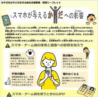 メディアコントロールやメディア教育については、今後、大切になる取組として各学校でも行われています。子どもたちは、1日にどのくらいの時間、スマホやゲーム機を使用しているでしょうか。スマホやゲーム機が与える体の影響について、啓発リーフレットが届いています。(添付ファイル参照)