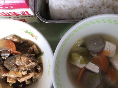 麦ご飯 ナスの甘辛炒め つみれ汁