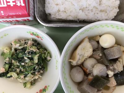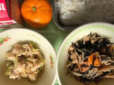 千切り大根とひじきの煮物は、味がしみこみ、美味しくいただきました。千切り大根やなめ茸、みかんと秋の食材が献立になっています。