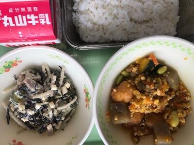 麦ご飯 カボチャのそぼろ煮 ごぼうとヒジキのサラダ