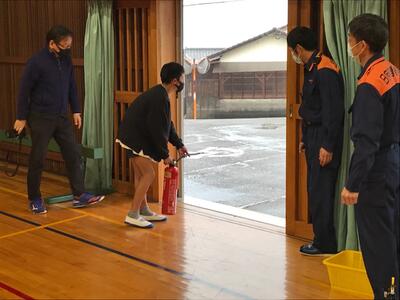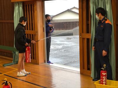 また、消化器の使い方を教えてもらい、6年生児童による実演を行いました。これから、乾燥する時期ですので火の取り扱いには注意したいと感じました。ご指導いただいた日向消防署の方々、本当にありがとうございました。