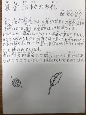 先月、全校で運営委員会を中心に、赤い羽根共同募金活動を行いました。多くの児童、家庭にご協力をいただき、9950円の募金が集まりました。ご協力頂きありがとうございました。