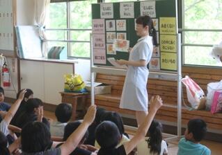 歯科衛生士の方々においで頂き、歯みがきの授業を毎年、上学年と下学年に分かれて行っています。