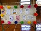 そこで、玄関から入った階段横のスペースに「牧水コーナー」を設置しています。「牧水コーナー」では、牧水先生の写真や本、短歌の短冊などを展示しています。また、朝の短歌朗詠用の大型短冊も設置してあり、子どもたちは毎朝「牧水コーナー」の前で短歌の朗詠をしています。